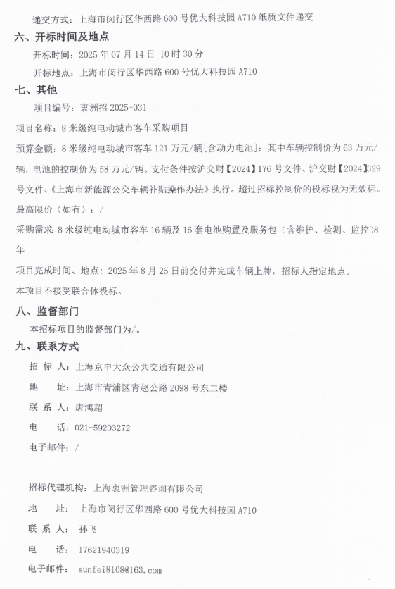 ①8米级纯电动城市客车采购项目公开招标,16辆,预算121万元/辆(含动力电池);②9米级纯电动城市客车采购项目公开招标,21辆,预算127万元/辆(含动力电池);③10米级纯电动城市客车采购项目公开招标,12辆,预算138万元/辆(含动力电池)。