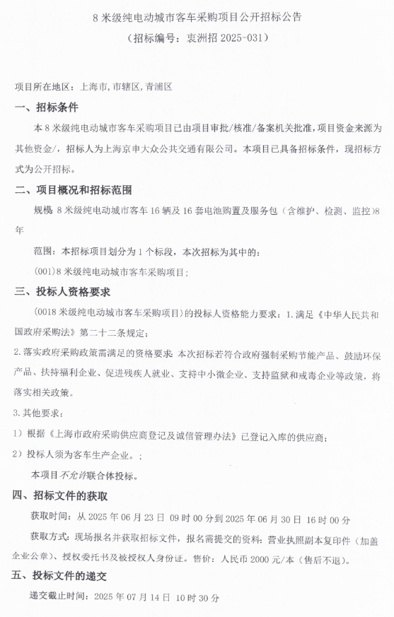 8米级纯电动城市客车采购项目公开招标公告