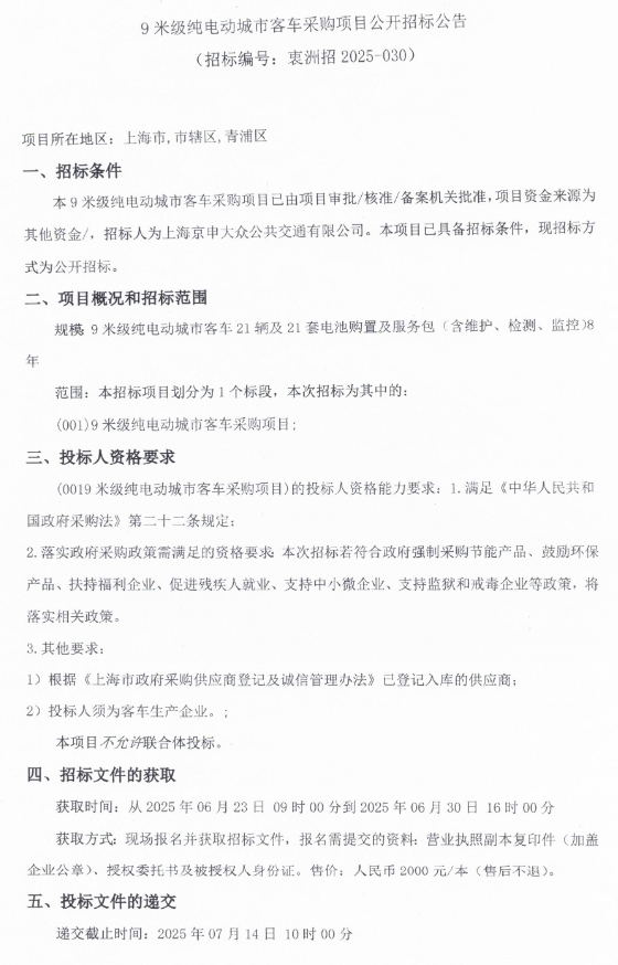 9米级纯电动城市客车采购项目公开招标公告鼎盛配资