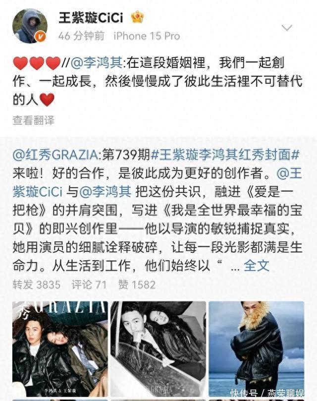 所以,这张结婚官宣为什么能让业内集体转发?因为它把“爱情”写成了“项目书”:1. 共同愿景——一起拍好电影;2. 资源互补——她出钱出力,他出才华出时间;3. 风险共担——票房砸了,爱情不能砸,反之亦然。把婚姻当成创业公司,股份各占 50%,谁也别想躺平,谁也别想独大。听起来像 KPI,却比玫瑰更浪漫:玫瑰会枯萎,KPI完成那天,他们一起上台领奖,奖杯可以当家里的水果盘。